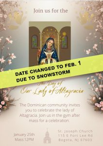 The Dominican community invites you to celebrate the Lady of Altagracia. Due to the snow forecast for 1/25, we are…